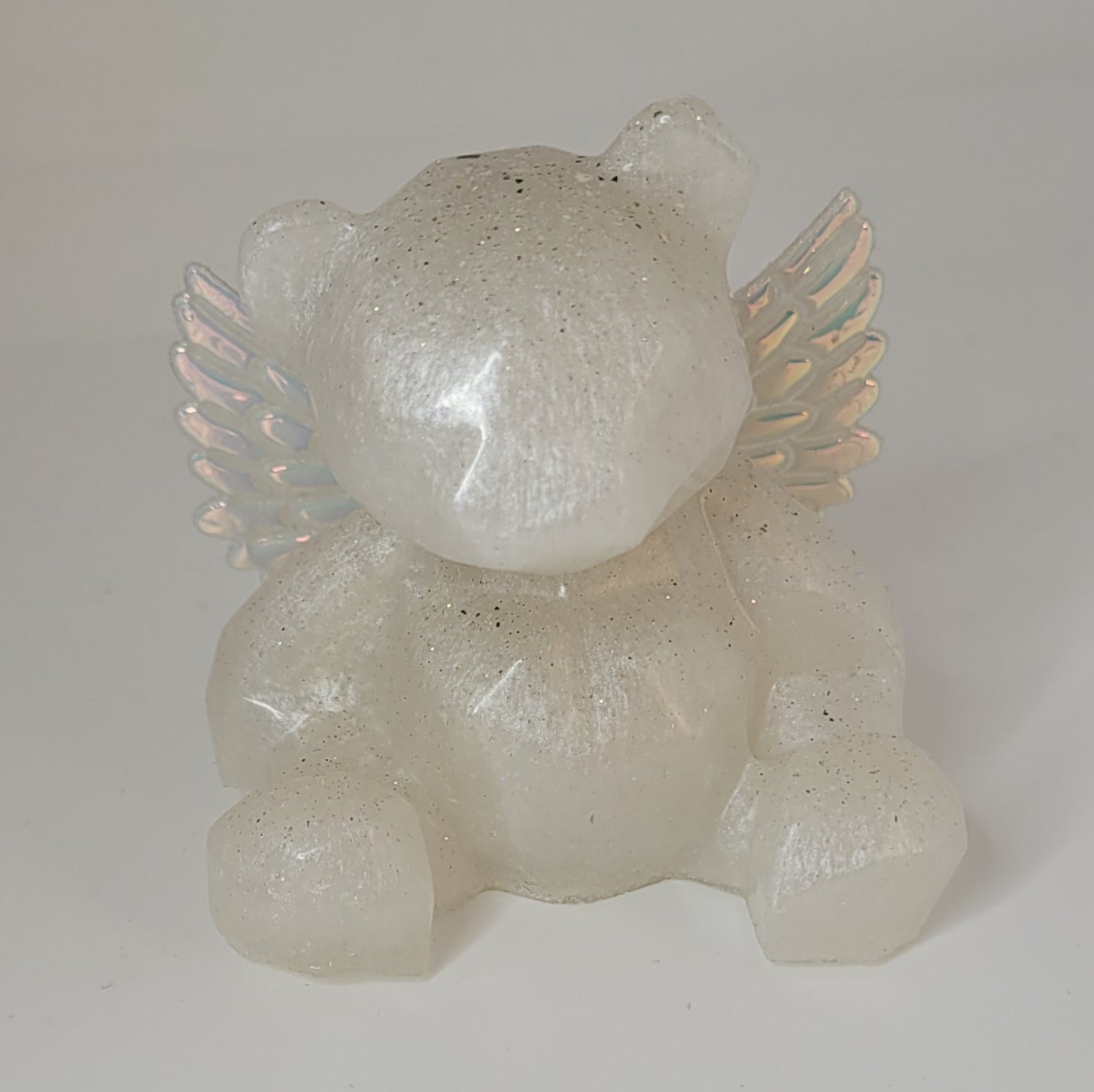 This diamond cut bear is created using a single solid colour of your choice, your inclusion of ashes are carefully combined so they are encapsulated throughout the bear. Angel wings are then added to the bears back, making it a beautiful memorial Angel bear