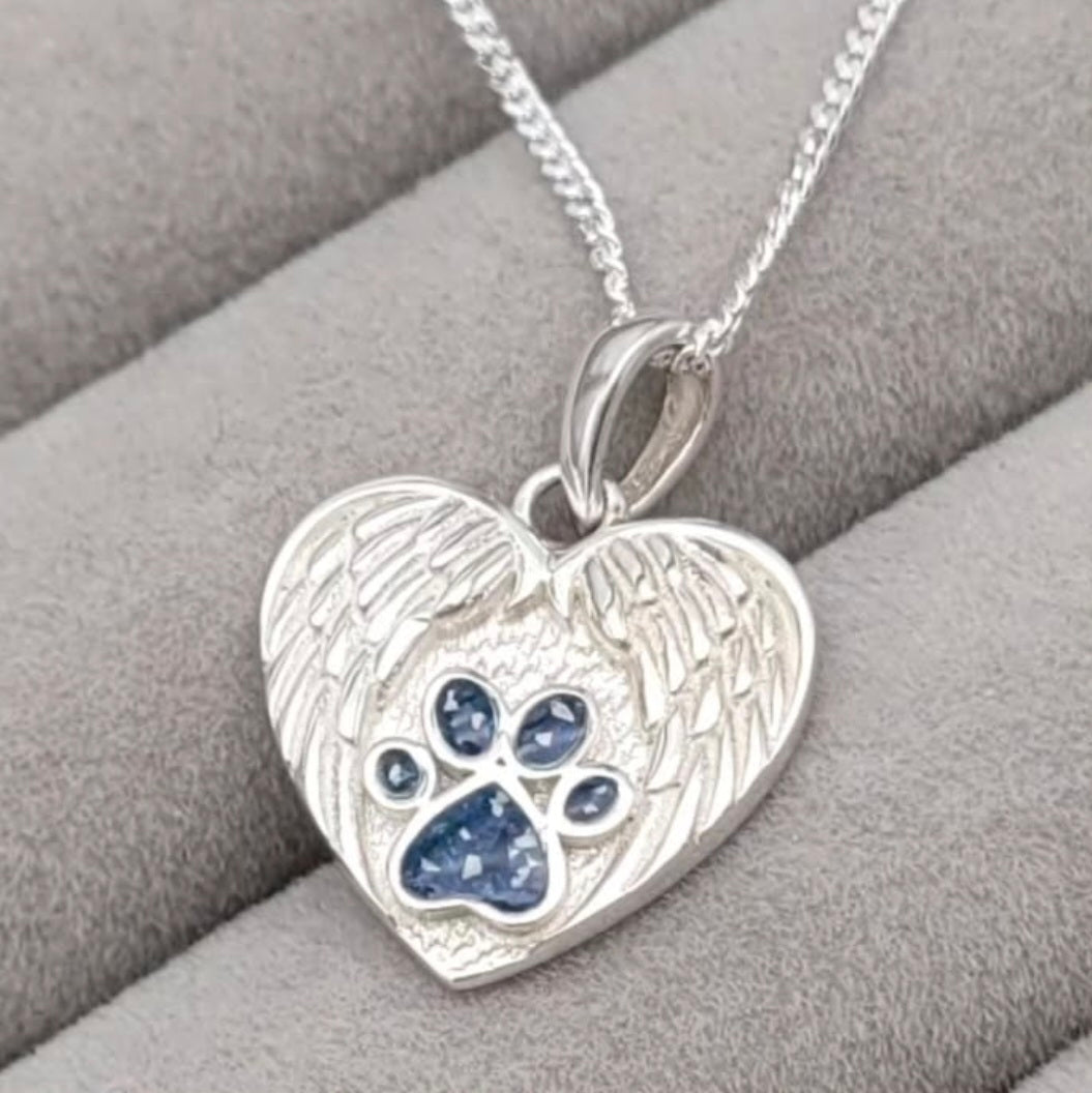 A beautiful paw print, that is held protectively within open angel wings. The ashes of your loved companion are set inside the 5 bezels that make up the paw print.