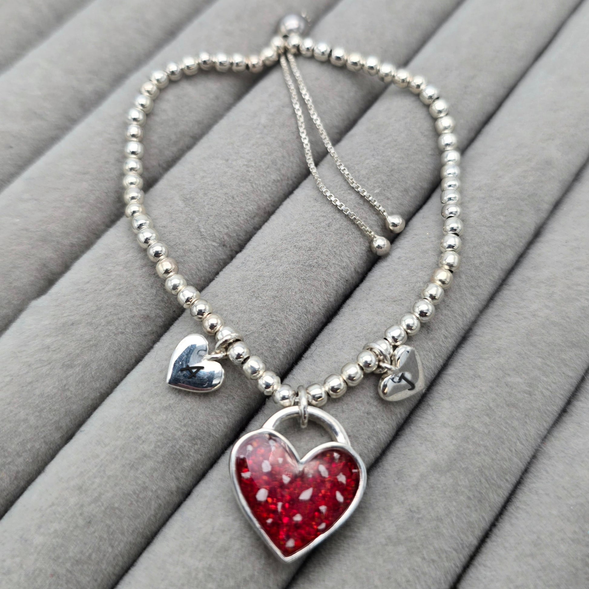 This beautiful size adjustable beaded bracelet has a large heart of approx 17mm x 16mm to hold your inclusion with a base colour of your choice. Two small hearts of approx 8mm sit either side of the larger heart. These can have an initial added to them free of charge.