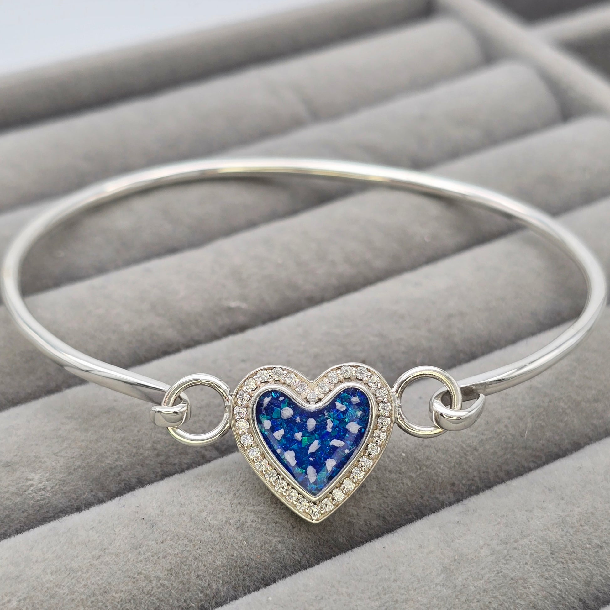 This CZ heart bangle has a heart shaped bezel of approx 10mm, the heart is surrounded by cubic zirconia stones giving it an overall size of approx 15mm. It can be created in any base/colour of your choice.The bangle is available in sizes small 17cm, medium 19cm and large 21cm. It's solid silver and weighs between 8g to 10g so comes fully hallmarked.
