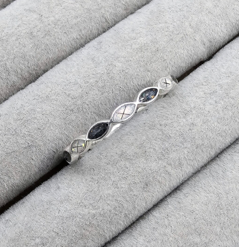 This ring is made up of almond eye shaped bezels that continue around the entire ring. Each bezel will hold your loved ones Inclusions in your base/colour of choice, either all the same or different colours in each one.
