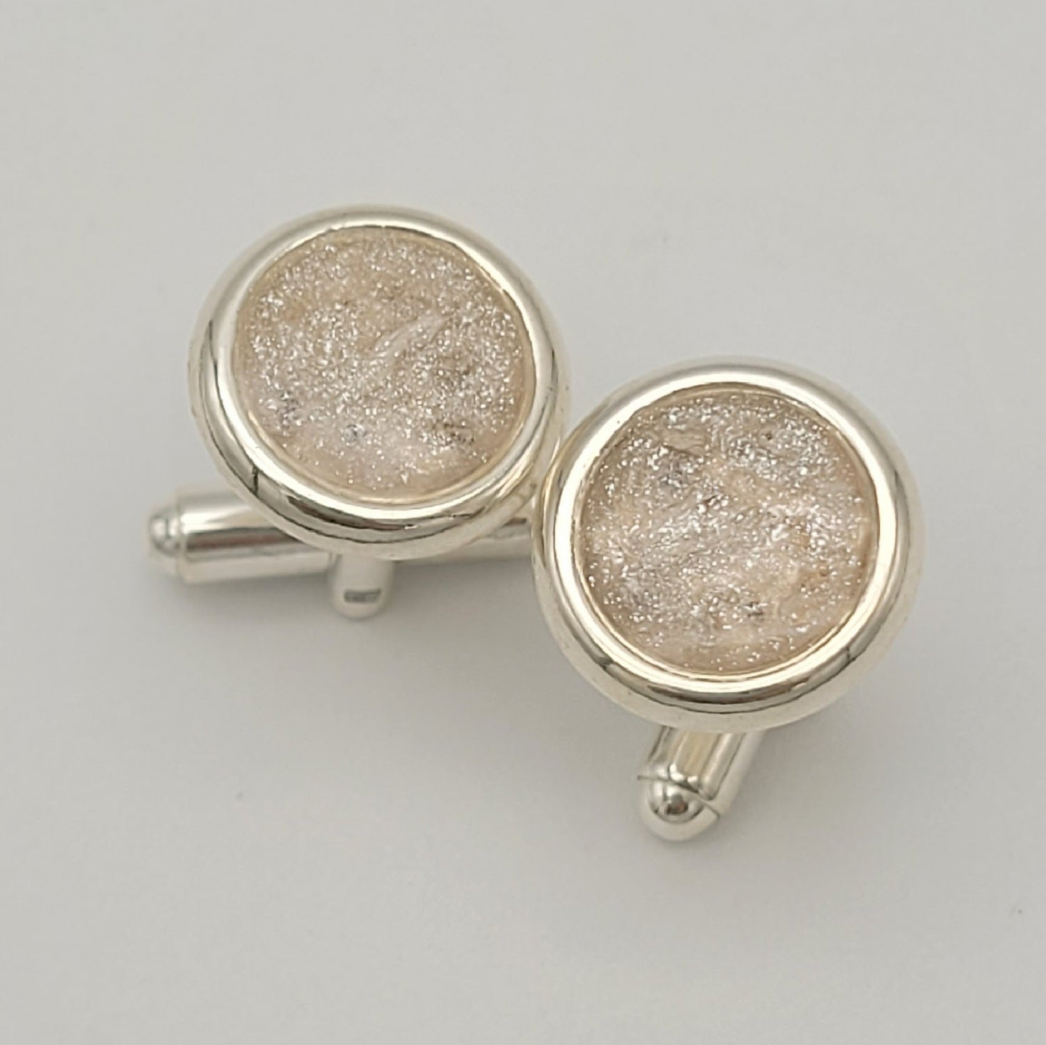 A pair of round cufflinks, a thick edge surrounds a 10mm bezel, that will safely hold your inclusion of choice.