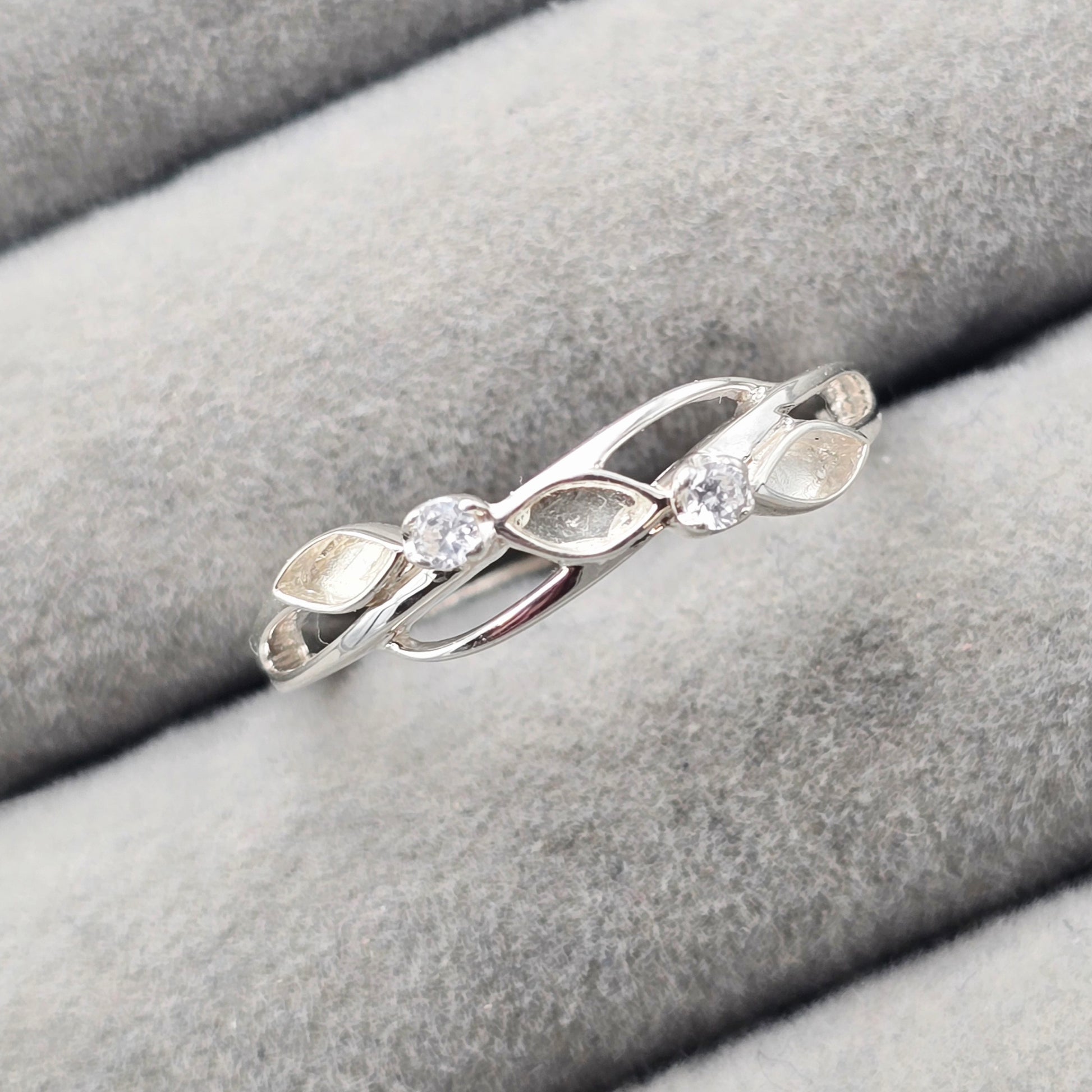 This beautiful sterling silver ring has three marquise shaped bezels set across the ring band in a delicate flowing design with 2 cubic zirconia stones.