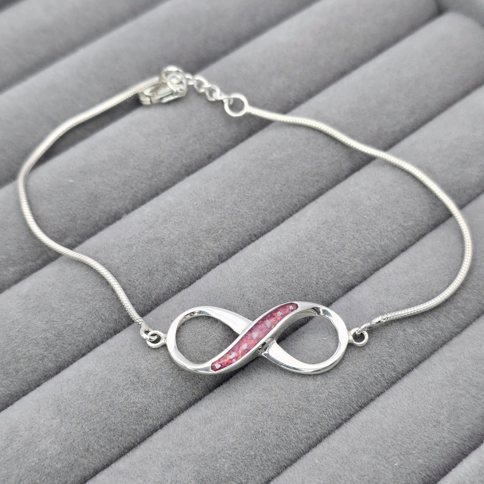 A beautiful bracelet with the infinity symbol making it a lovely choice for cremation ashes, they are held within the solid infinity symbol in a colour of your choice. ✨️matching item available✨️