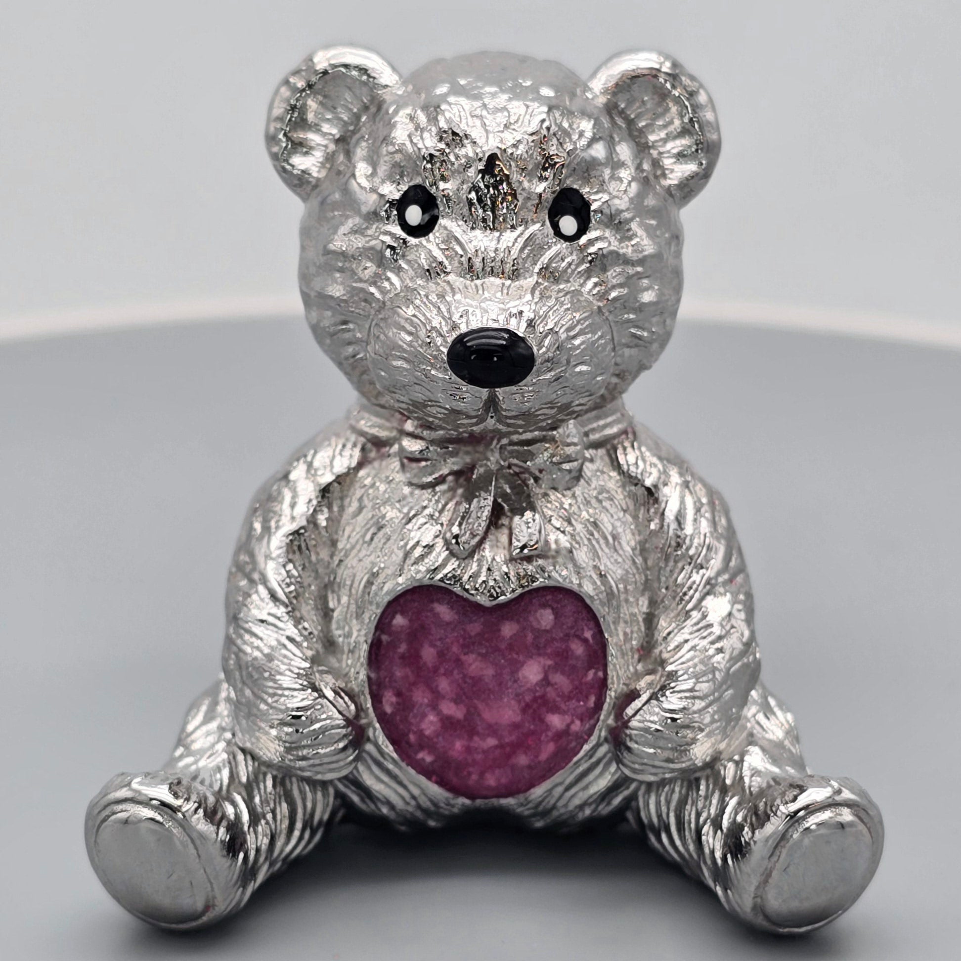 A heart shaped recess that sits on the bears front is where your inclusion is held, set on a colour base of your choice.
